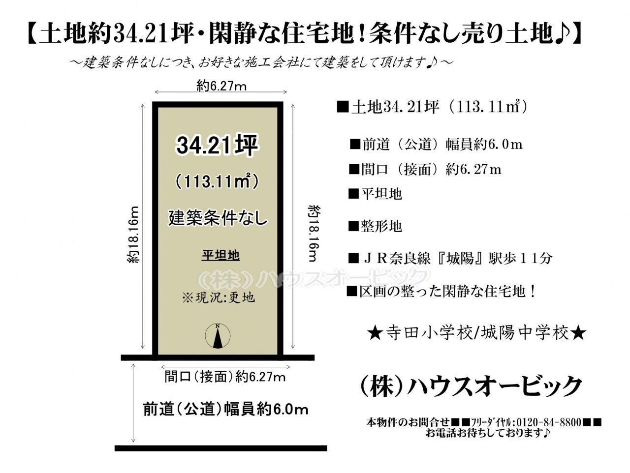 宇治市 不動産 > 城陽市 寺田市ノ久保 土地2号地(建築条件なし・土地34.21坪・更地)