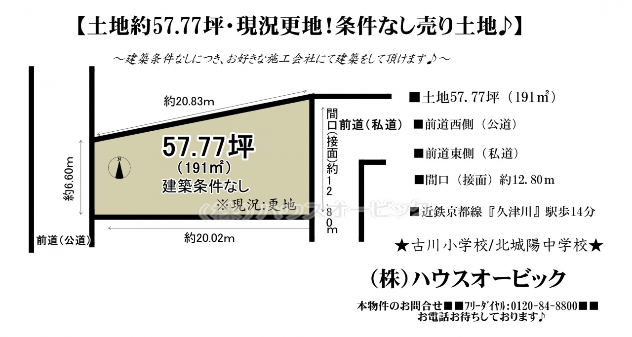 宇治市 不動産 > 城陽市 久世里ノ西 土地(建築条件なし・土地57.77坪・両面道路・更地)