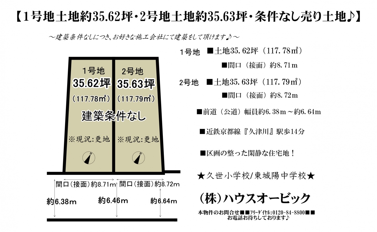 宇治市 不動産 > 城陽市 久世下大谷 土地2号地(建築条件なし・土地35.63坪・更地)
