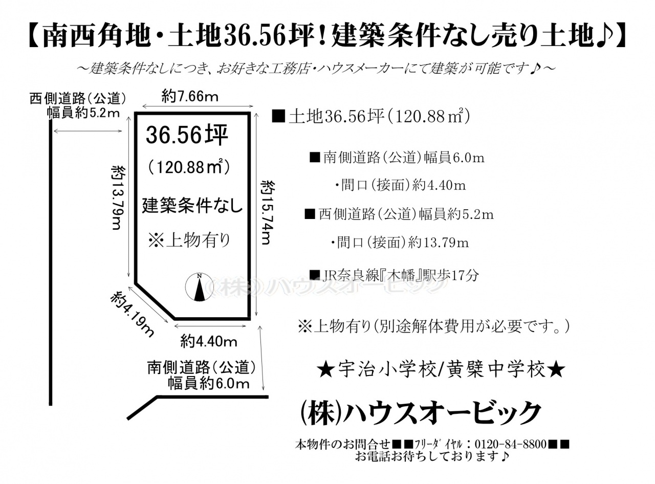 宇治市 不動産 > 宇治市 木幡南山 土地(建築条件なし・南西角地・土地36.56坪・古家あり)