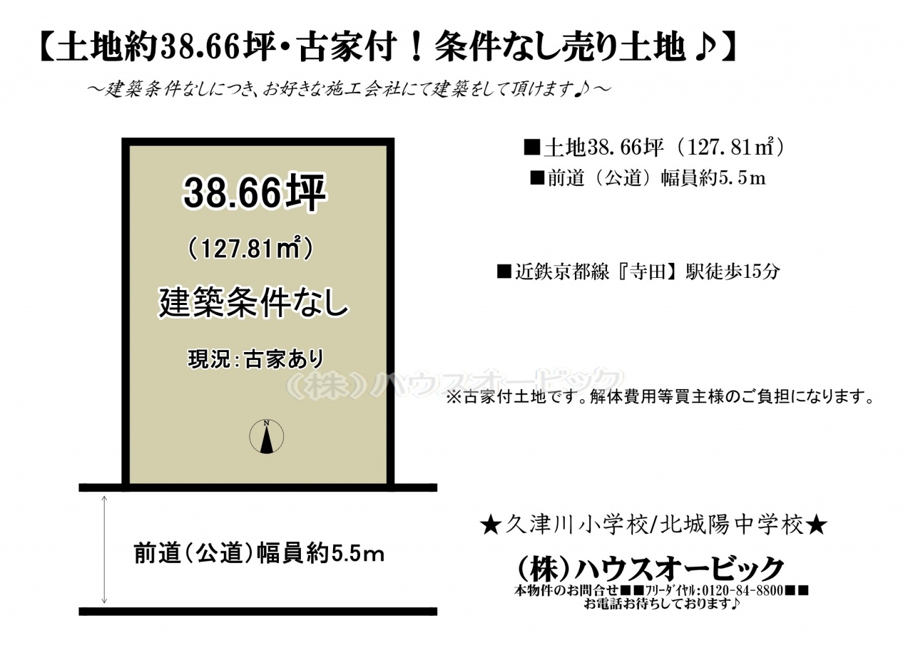 宇治市 不動産 > 城陽市 寺田今橋 土地(建築条件なし・土地38.66坪・古家付土地)